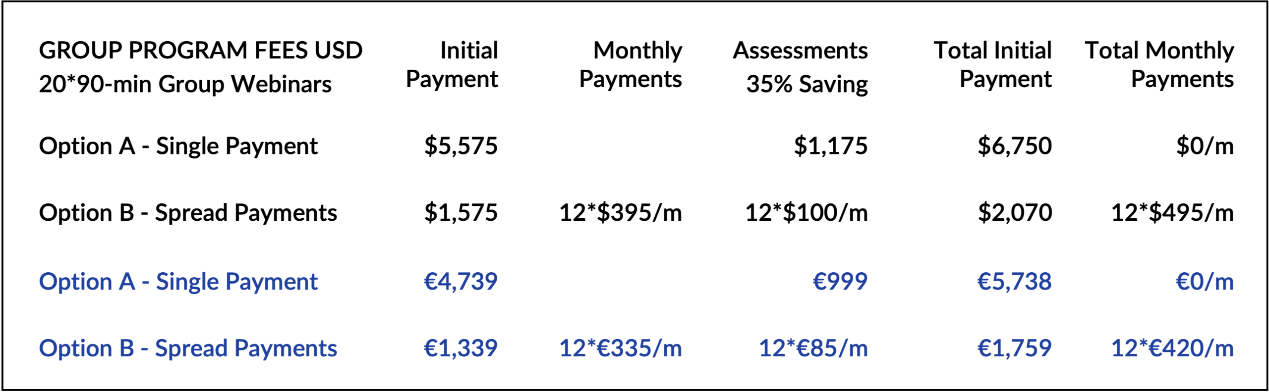 Our Fees are based on an initial payment to cover the extensive online resources and 12-monthly payments to cover the 20 live group Discovery Dialogues pa.