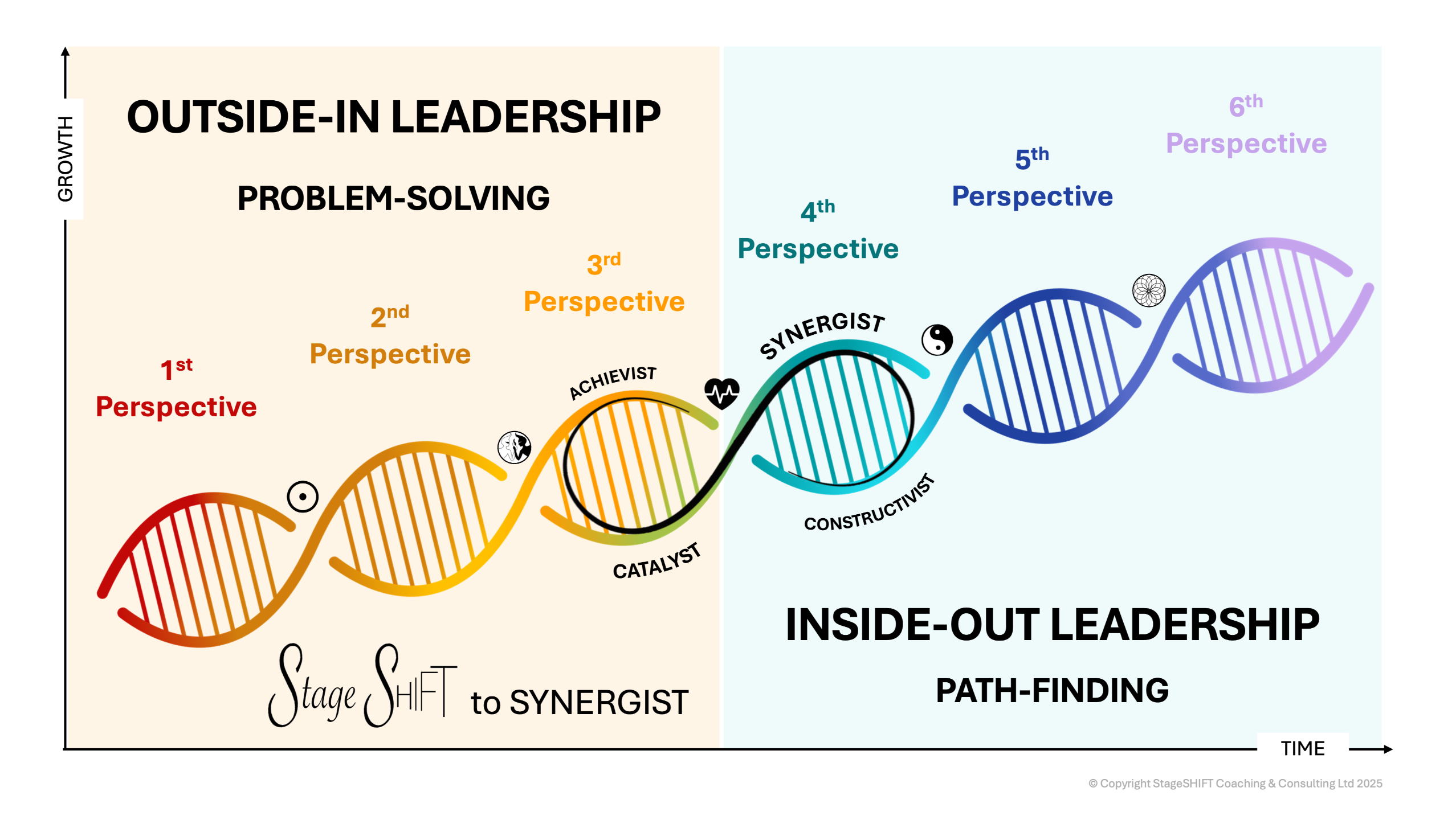 To flourish in stormy conditions, research shows that organizations need Executive Leaders with a Transforming Mindset and networked Synergist Leadership capacity at mature 4th Perspective. We've found that this capacity is latent within us and emerges organically with StageSHIFT's 3-Step System of Transformative Vertical Leadership Development.